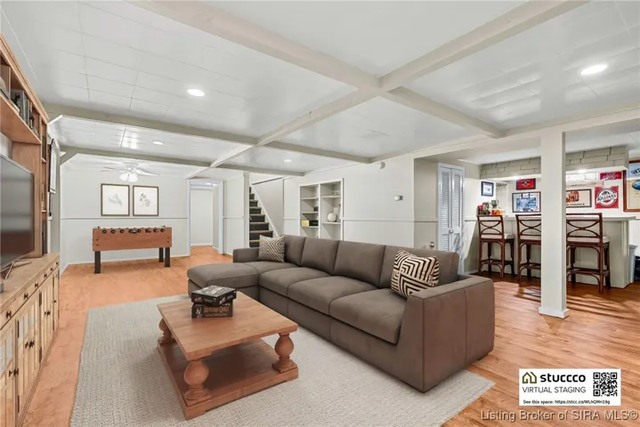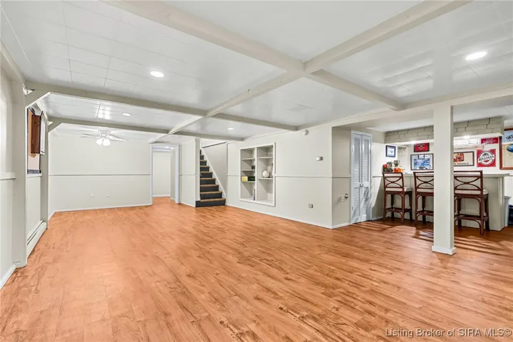 Upstairs, the primary suite includes a large bedroom area, multiple closets, and a private updated bath. The finished basement offers over 1,000 sq ft of additional living space, complete with a bar area and a bonus room perfect for a fourth bedroom or home office.